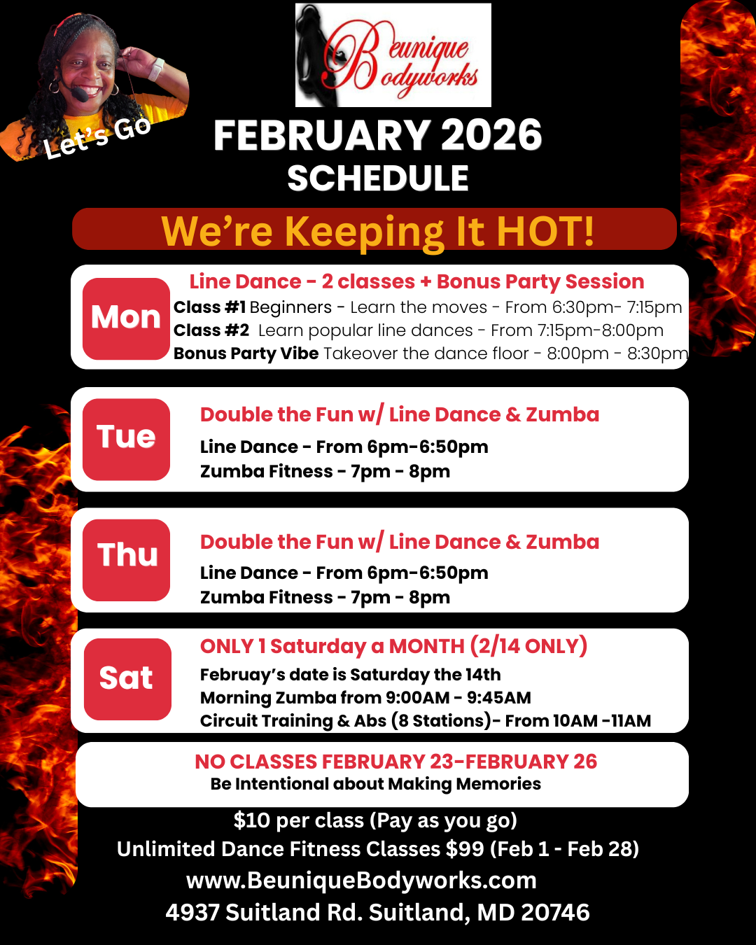 Valid for Unlimited Dance Fitness Classes from February 1, 2026 - February 22, 2026 (20 classes available) We will be closed Feb 23rd-28th.